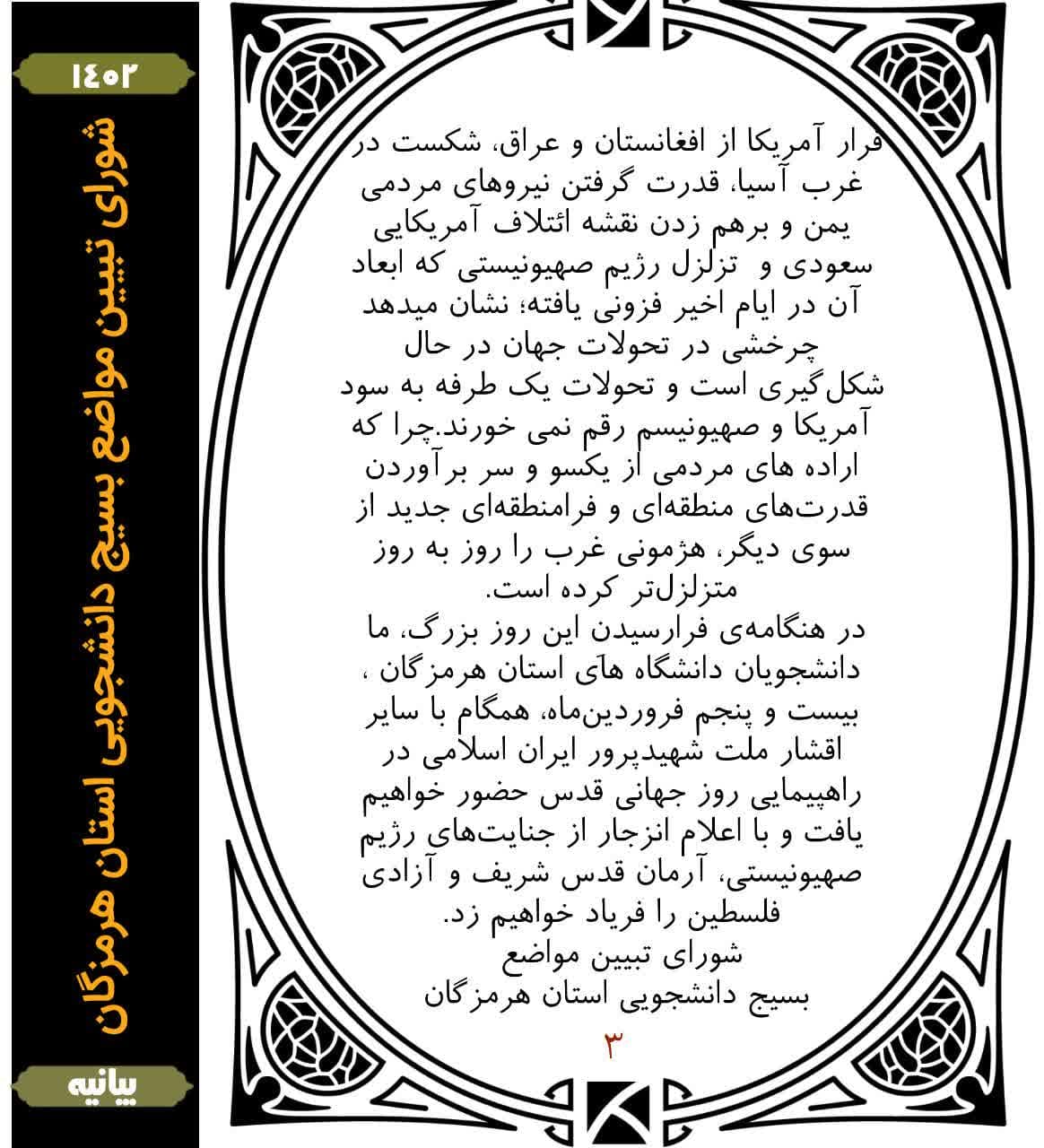 بمناسبت فرارسیدن روز جهانی قدس شورای تبیین مواضع بسیج دانشجویی استان هرمزگان بیانیه ای صادر کرد.